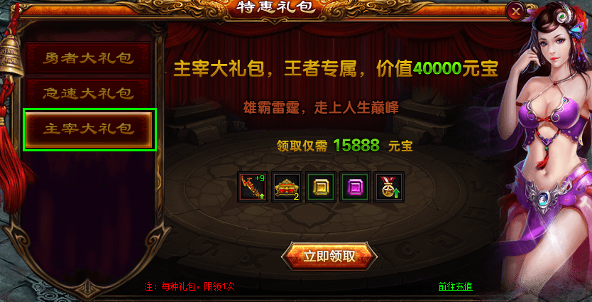 主宰大礼包,王者专属,价值40000元宝,雄霸雷霆,走上人生巅峰,领取仅需15888元宝