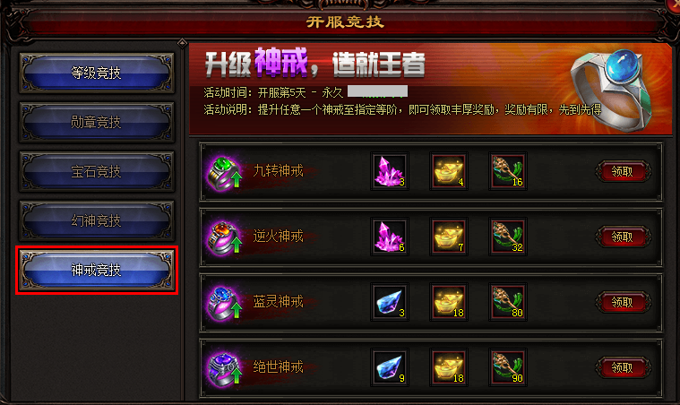 活动说明:只需提升任意一个神戒至指定等阶,即可领取丰厚奖励,奖励有限,先到先得